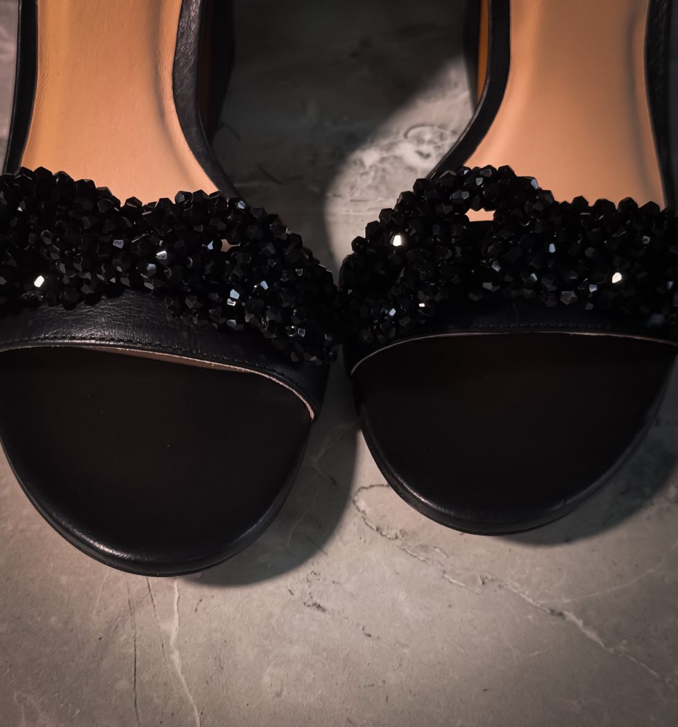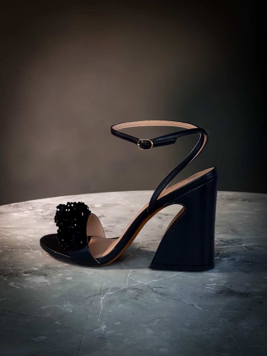 Command attention with Kimberly in classic black, a bold yet elegant leather sandal designed to make a statement. Featuring a sleek open toe, adjustable ankle strap, and a front strap adorned with stunning beaded embellishments, this style blends sophistication with modern glamour. The sculptural block heel adds a contemporary touch while providing balance and comfort for extended wear. Crafted from luxurious genuine leather with a smooth lining and outsole, Kimberly delivers all-day comfort and timeless appeal, making it your go-to heel for cocktail events, evening parties, or any special occasion.