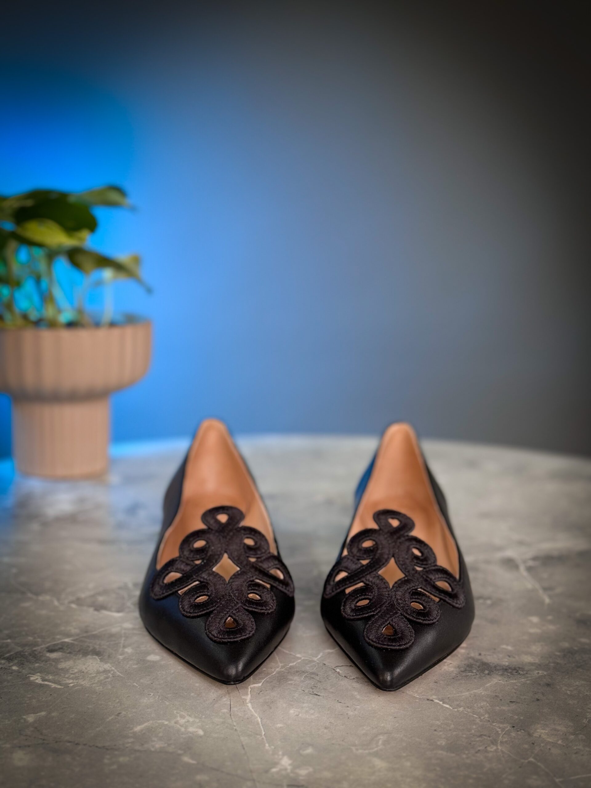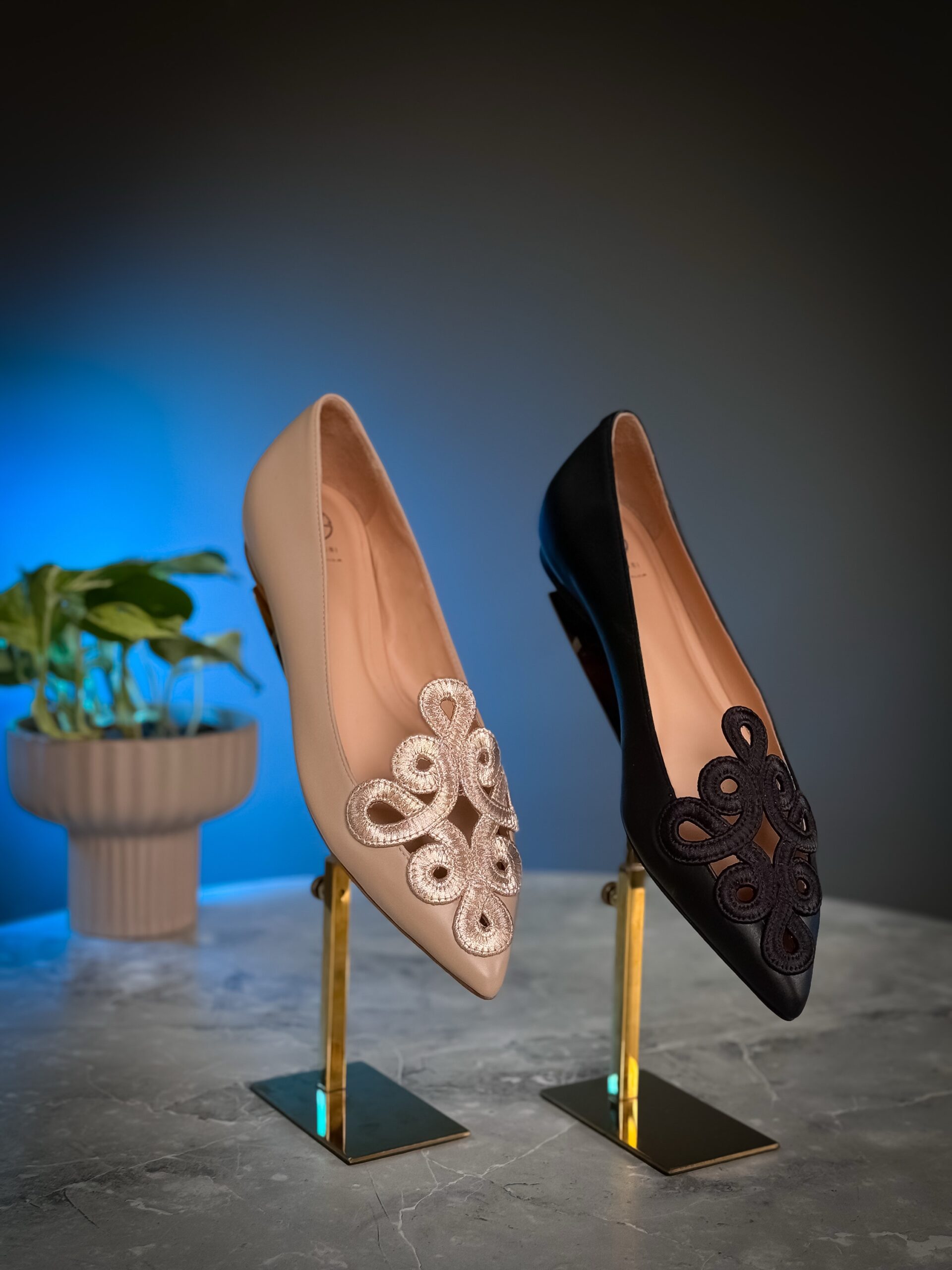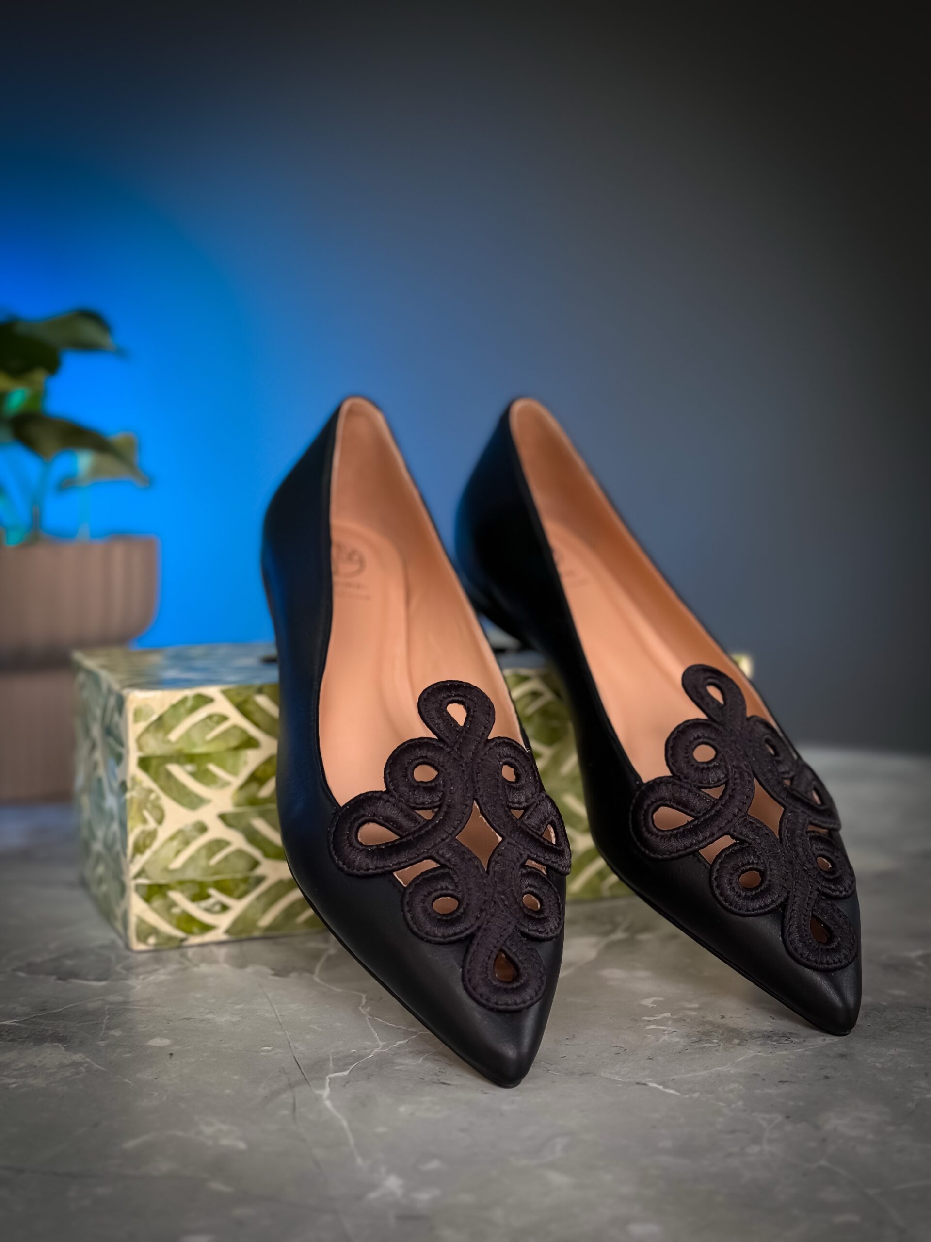 Meet Kris, where comfort meets high-fashion artistry. These elegant black pointed toe flats are designed with a striking cutout swirl detail across the vamp, adding a modern sculptural edge to a timeless silhouette. Crafted from genuine leather with a soft leather lining, Kris ensures day-long comfort without compromising on style. The sleek slip-on design makes them versatile for work, casual outings, or evenings when heels aren’t an option but elegance is a must. With a durable leather outsole and a flat profile, these shoes offer both lasting wear and effortless sophistication, making them a wardrobe staple for every stylish woman.